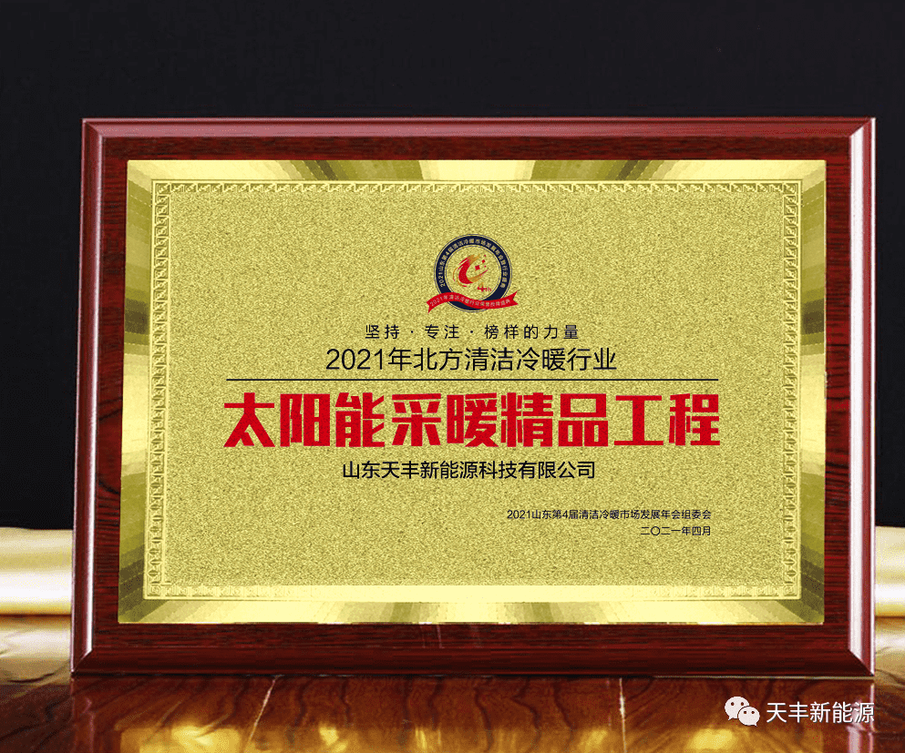 在大會(huì)特別設(shè)置的“2021北方清潔冷暖行業(yè)榮譽(yù)授牌儀式”版塊,天豐新能源公司榮獲“2021北方清潔冷暖行業(yè)突出貢獻(xiàn)單位”榮譽(yù)授牌、“2021北方清潔冷暖行業(yè)太陽(yáng)能采暖精品工程”榮譽(yù)授牌,天豐新能源總經(jīng)理張斌被評(píng)為“2021北方清潔冷暖行業(yè)突出貢獻(xiàn)人物”。