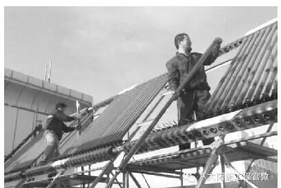 2.安裝中注意細節:首先組裝太陽能支架,再裝水箱,連接輸水管道,然后打開上水閥門上水,水從插口處溢出后再裝真空集熱管(此時裝真空管避免空曬,即使室外溫度再高也不會炸管)。